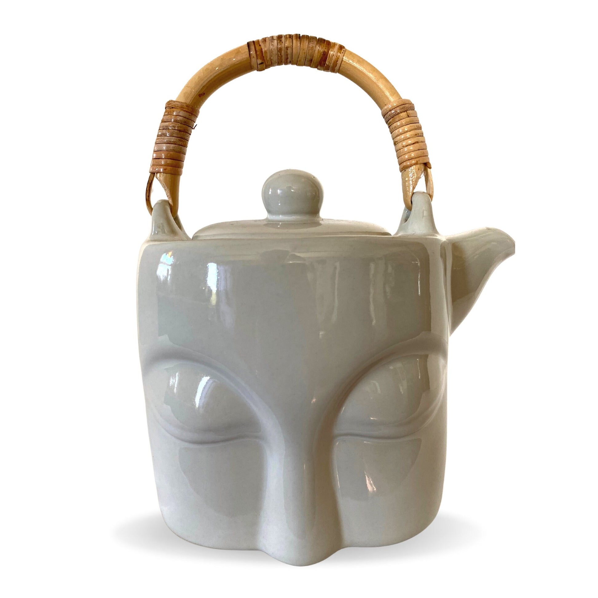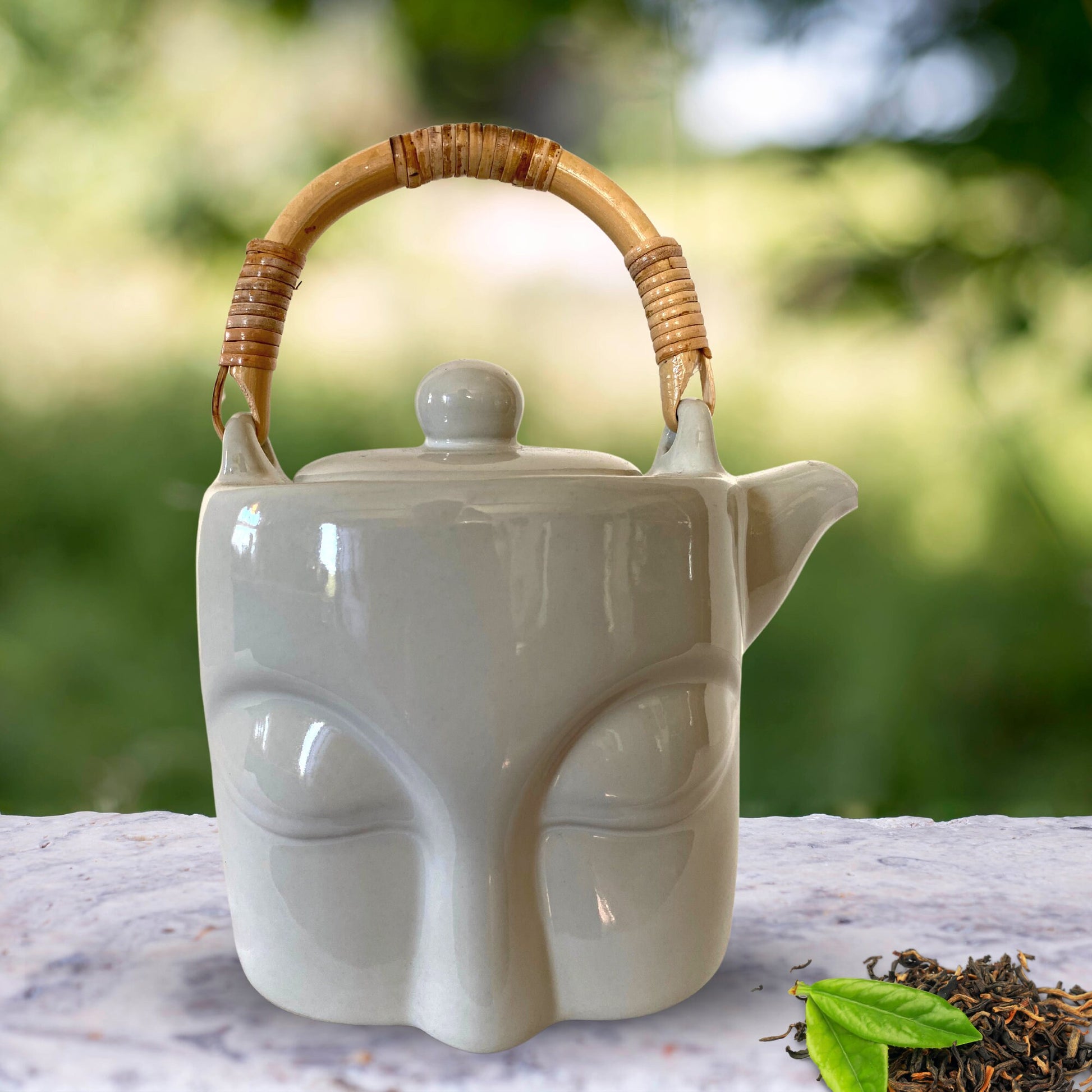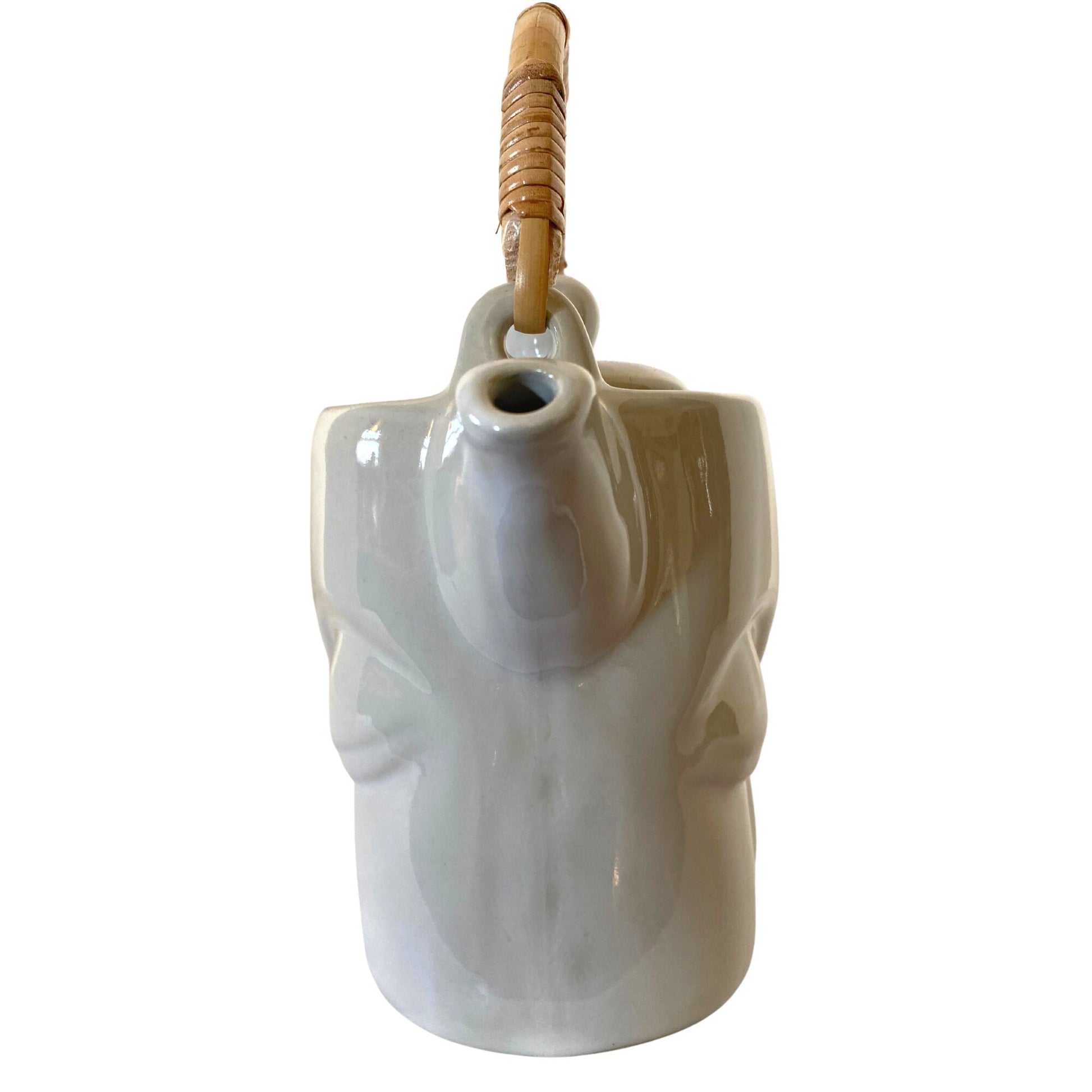 Wise Eyes of Buddha Ceramic Teapot, handcrafted in Bali's west coast, famous for their pottery and terracotta ware. The Wise Eyes of Buddha grace the front and back of the teapot. Has a beautiful natural rattan handle that you can remove for washing. Glazed in smooth white handcrafted celadon pottery. Lead free and food safe. A unique gift or whimsical decoration for your home!