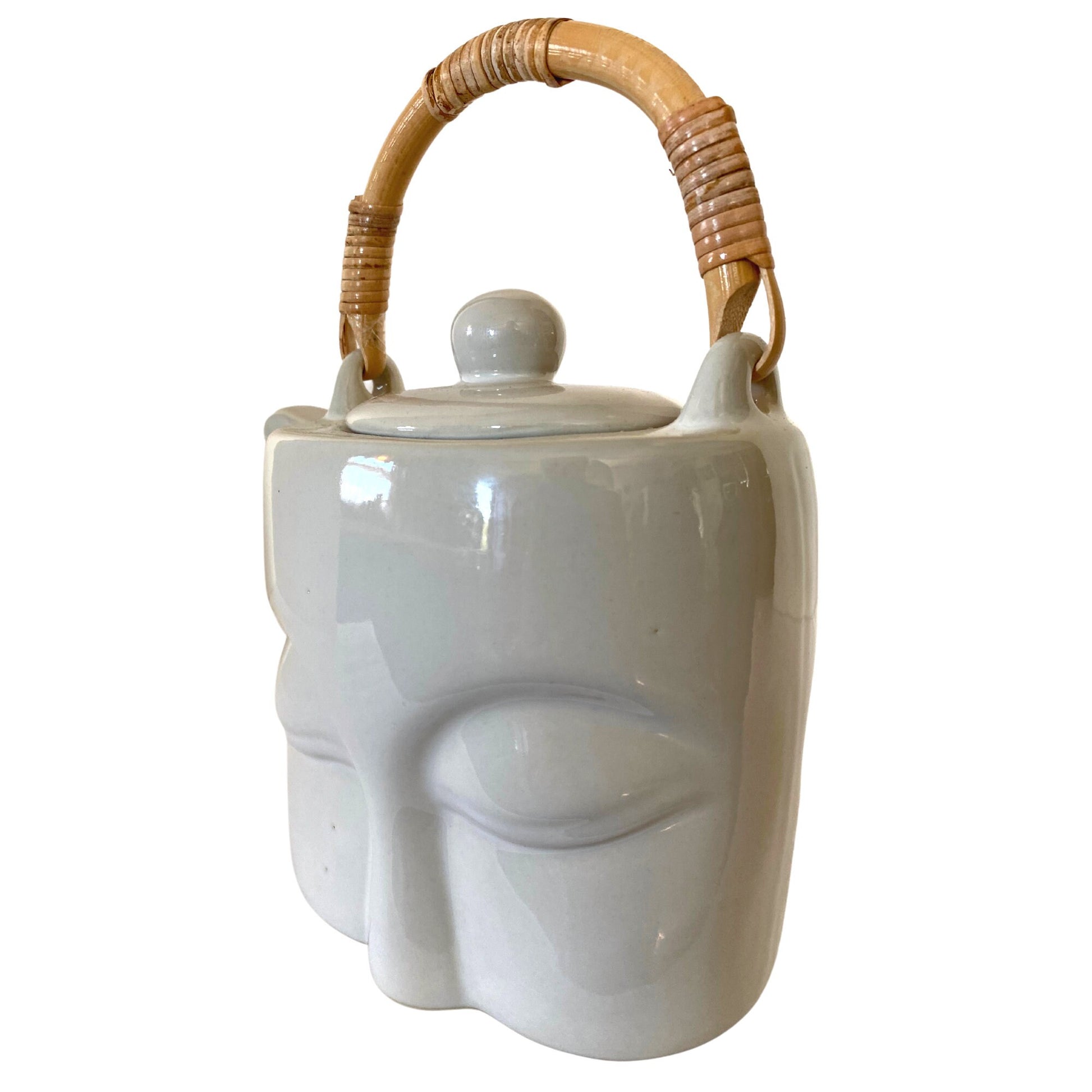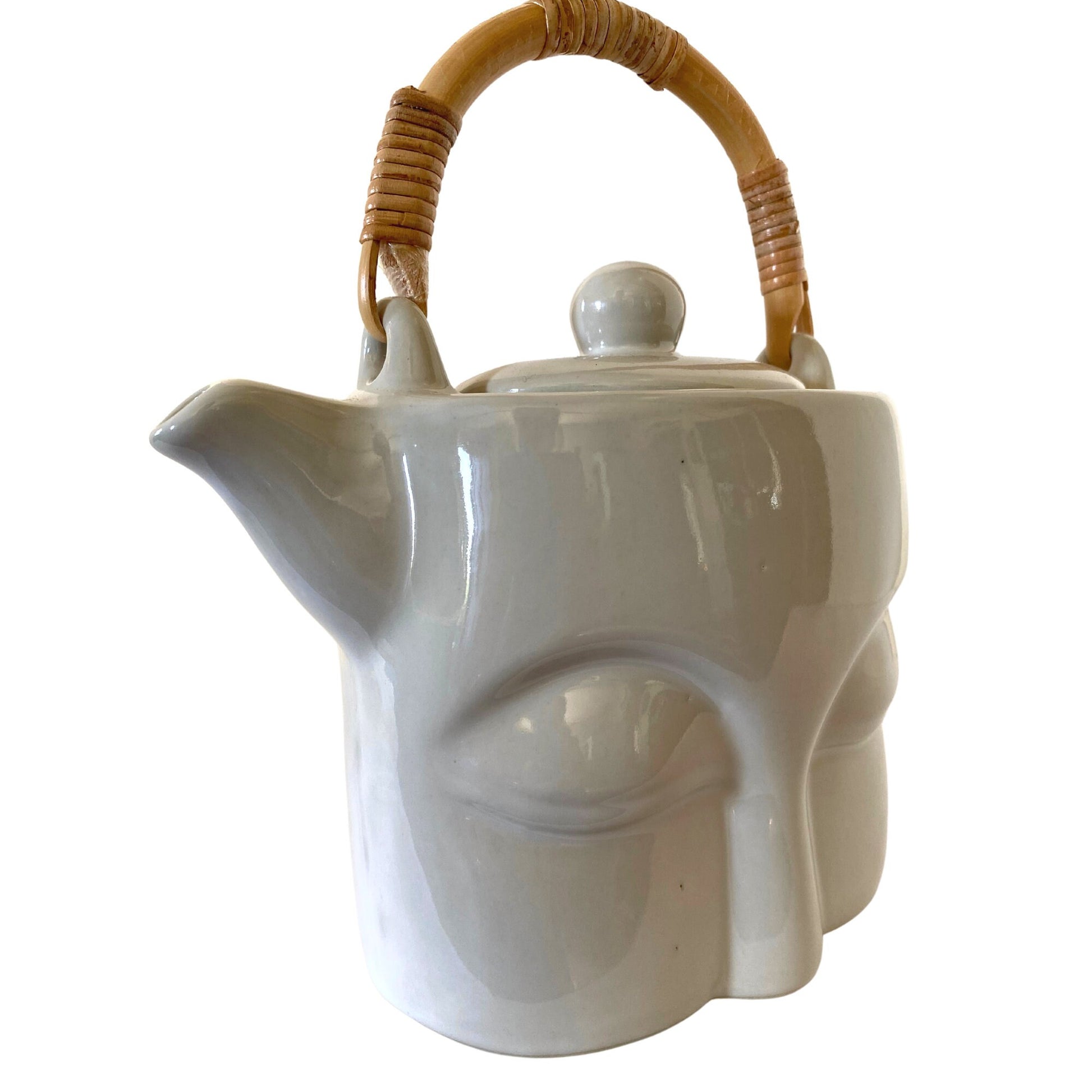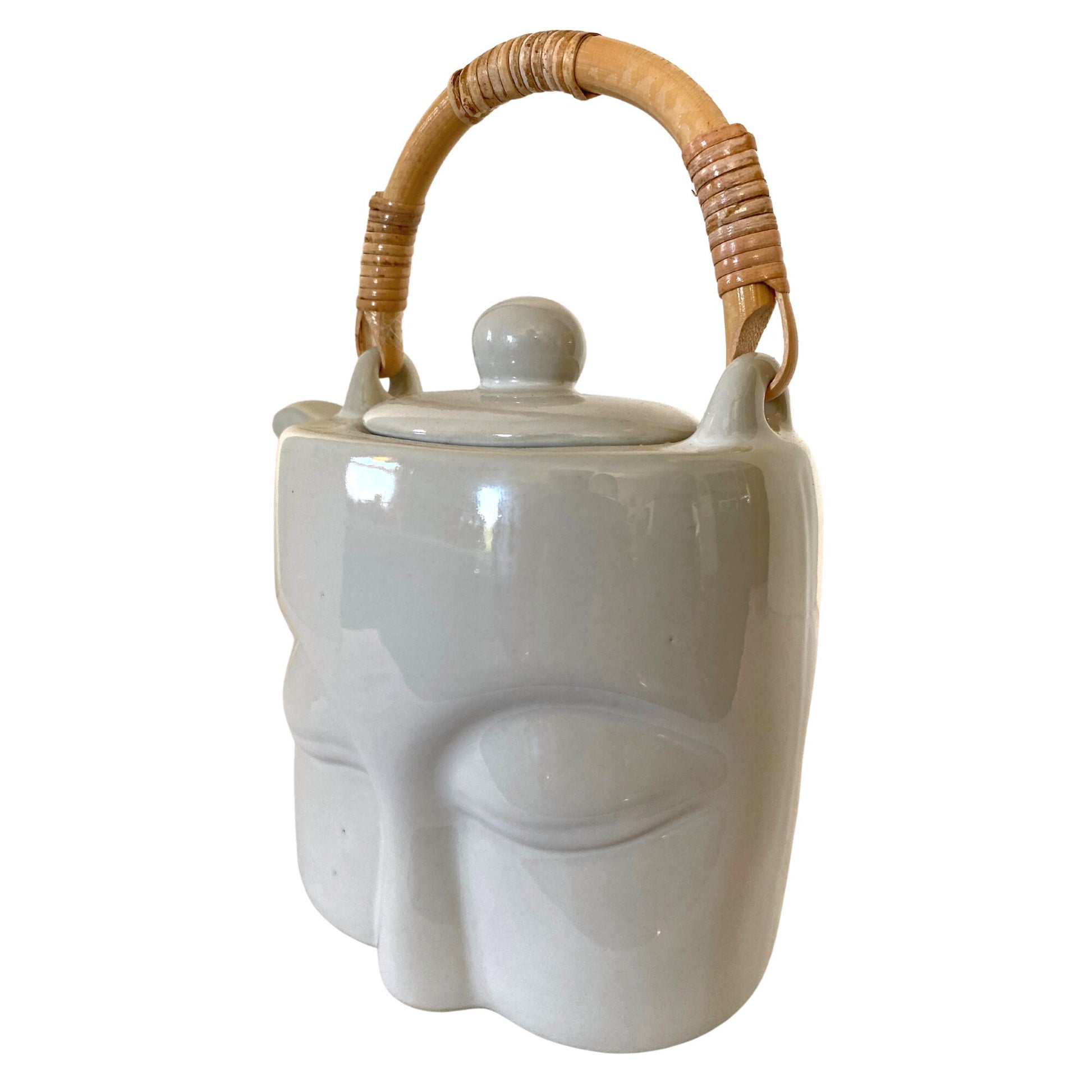 Wise Eyes of Buddha Ceramic Teapot, handcrafted in Bali's west coast, famous for their pottery and terracotta ware. The Wise Eyes of Buddha grace the front and back of the teapot. Has a beautiful natural rattan handle that you can remove for washing. Glazed in smooth white handcrafted celadon pottery. Lead free and food safe. A unique gift or whimsical decoration for your home!