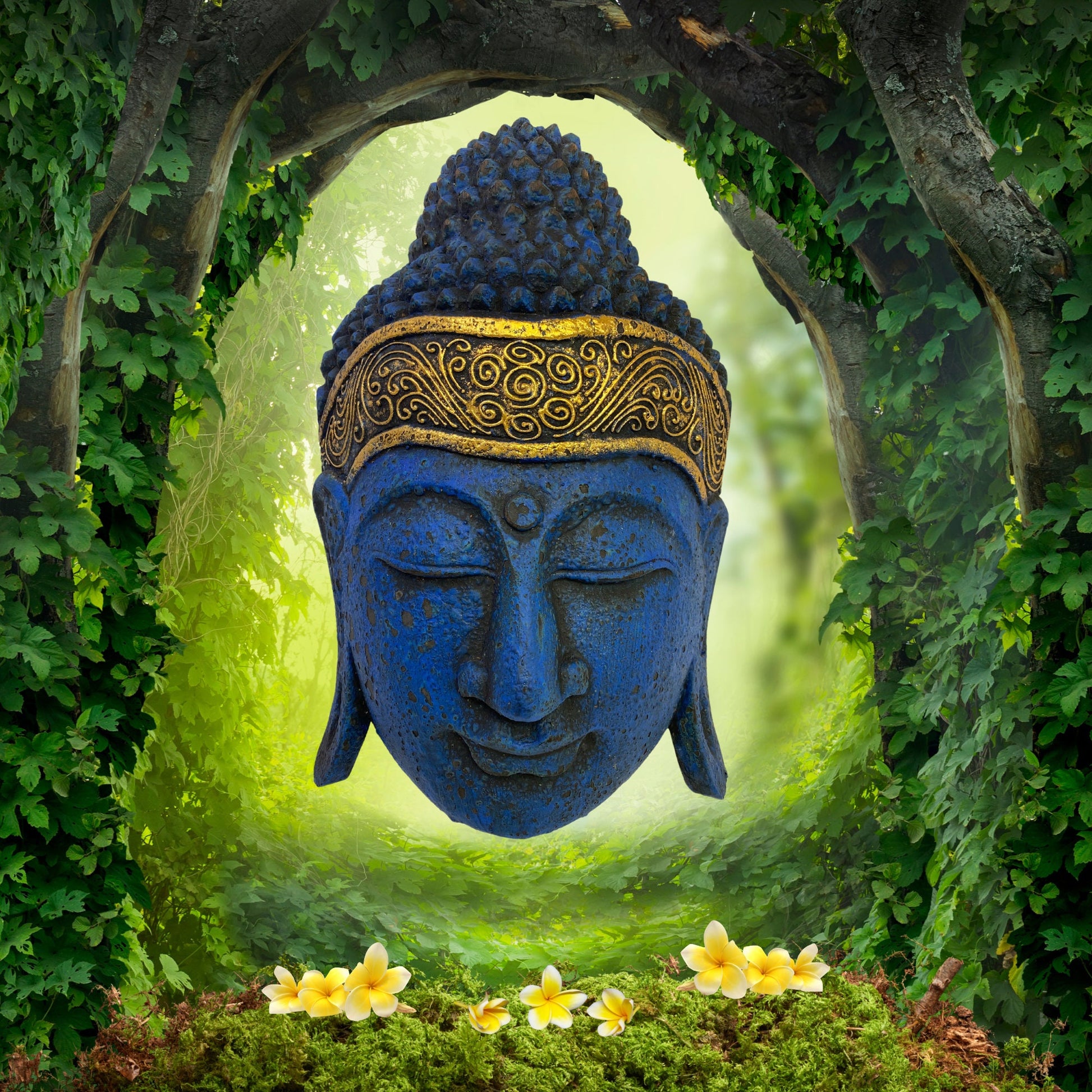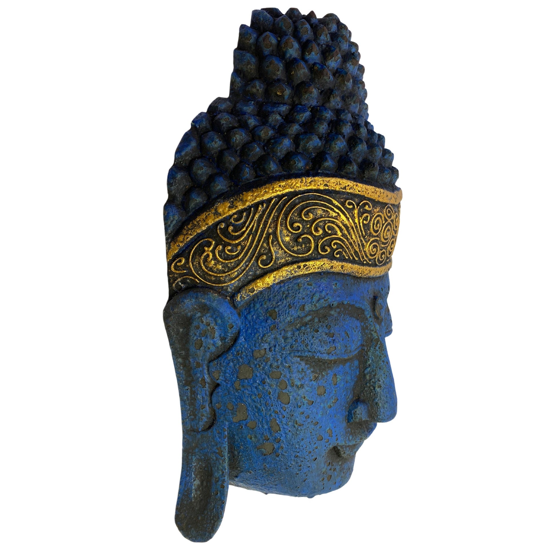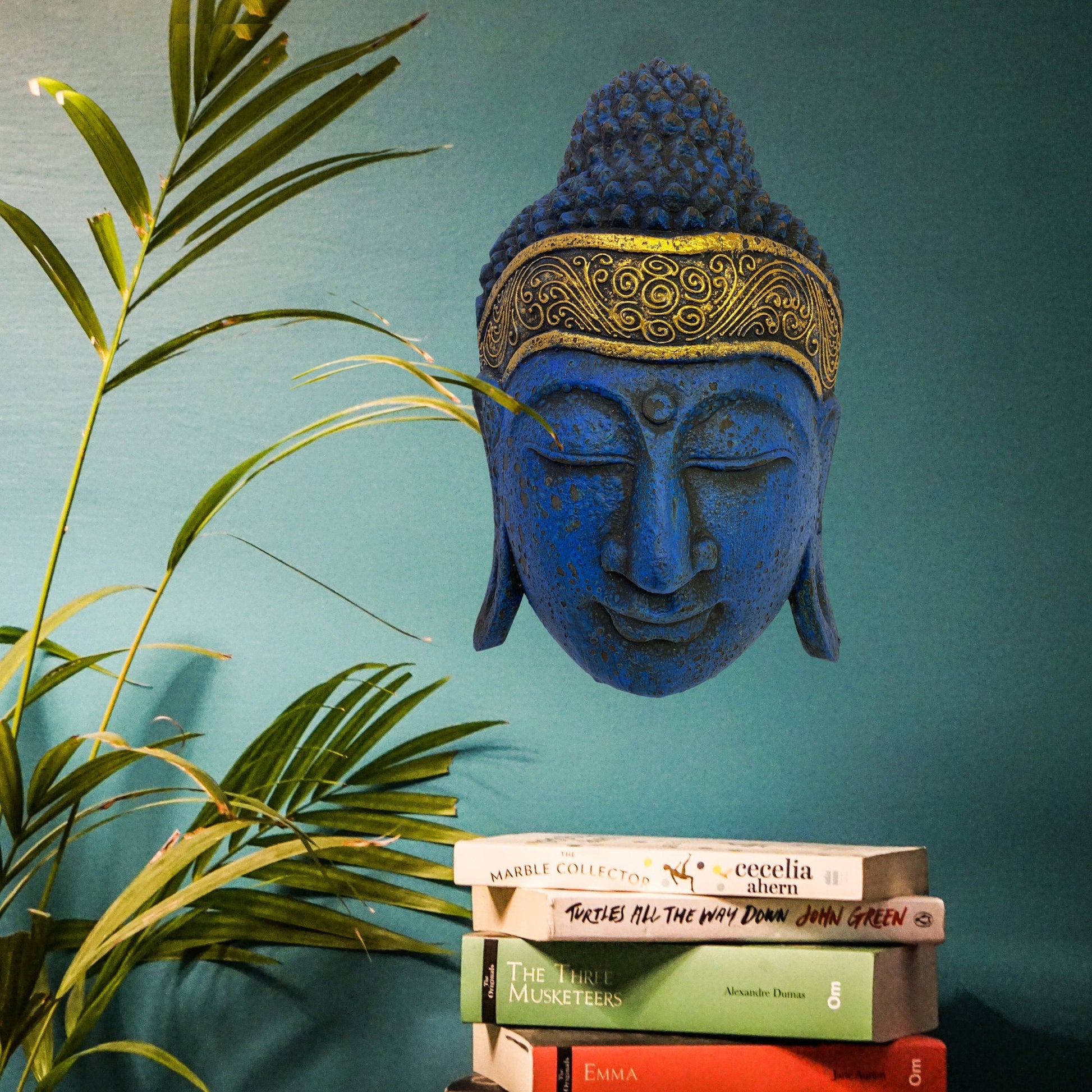 Wooden Blue Buddha Mask Hand Carved Wood Carving Balinese Eclectic Wall decor Folk art Handmade 16"