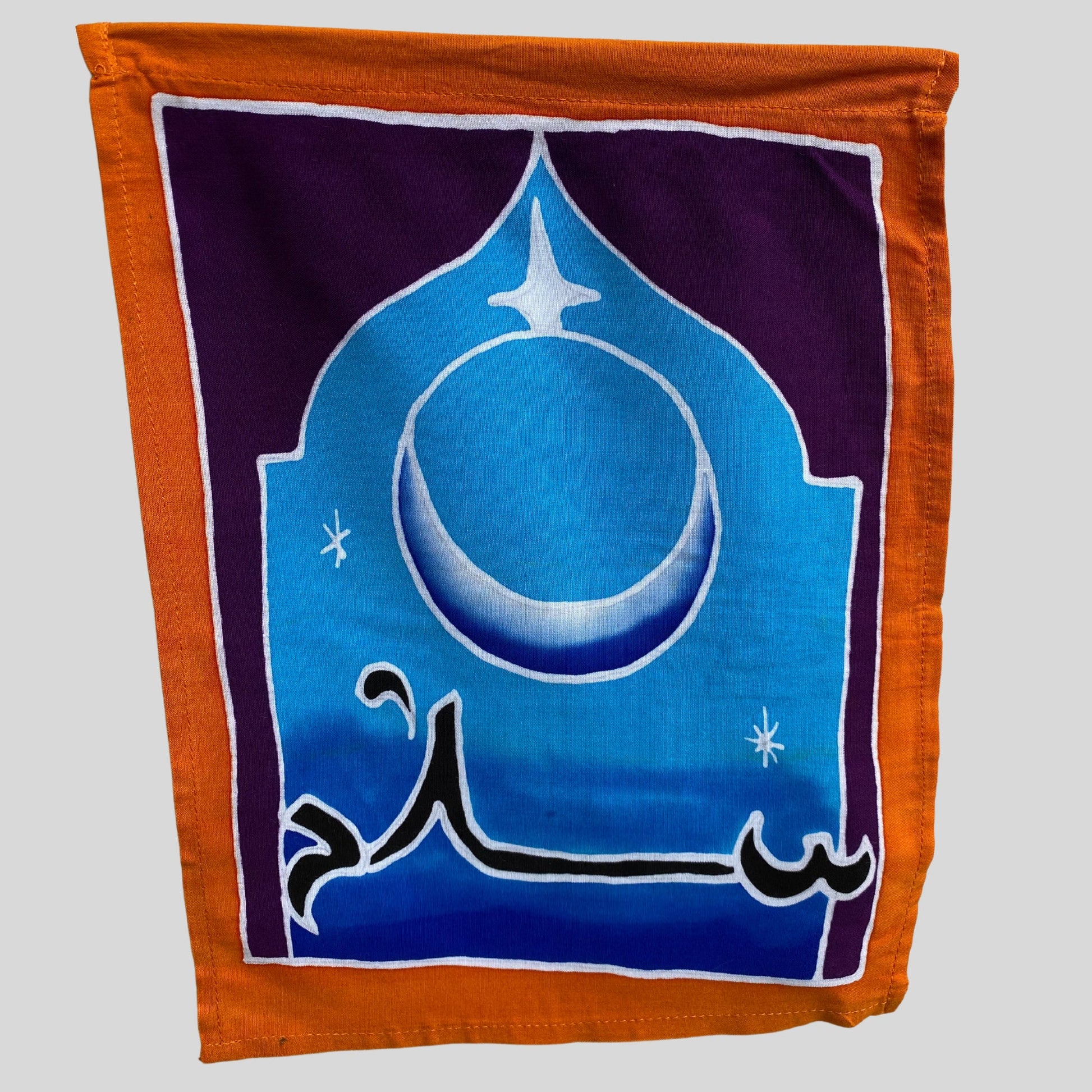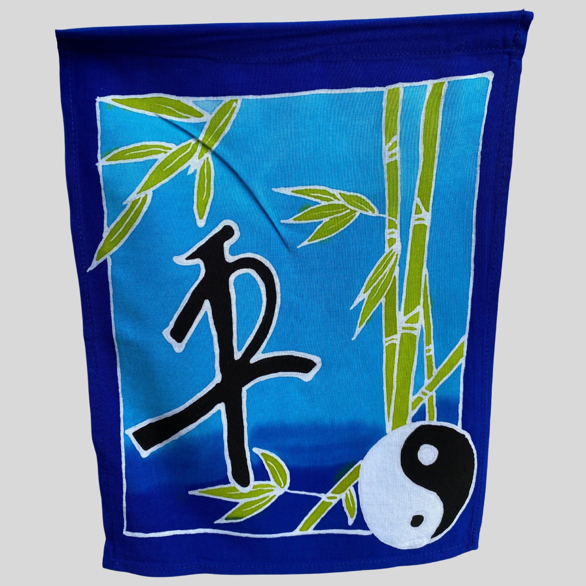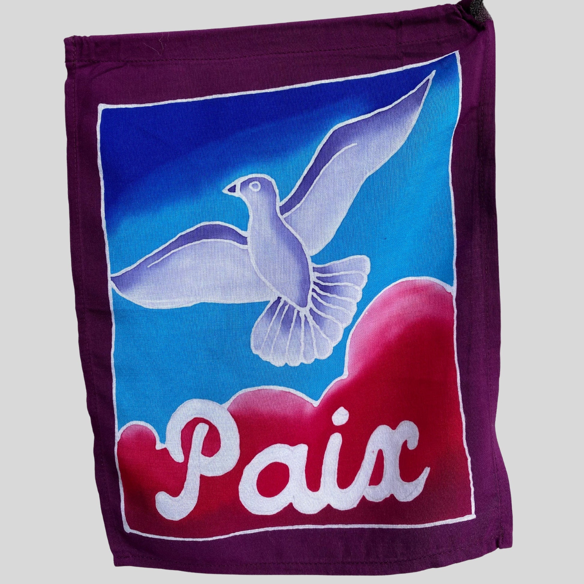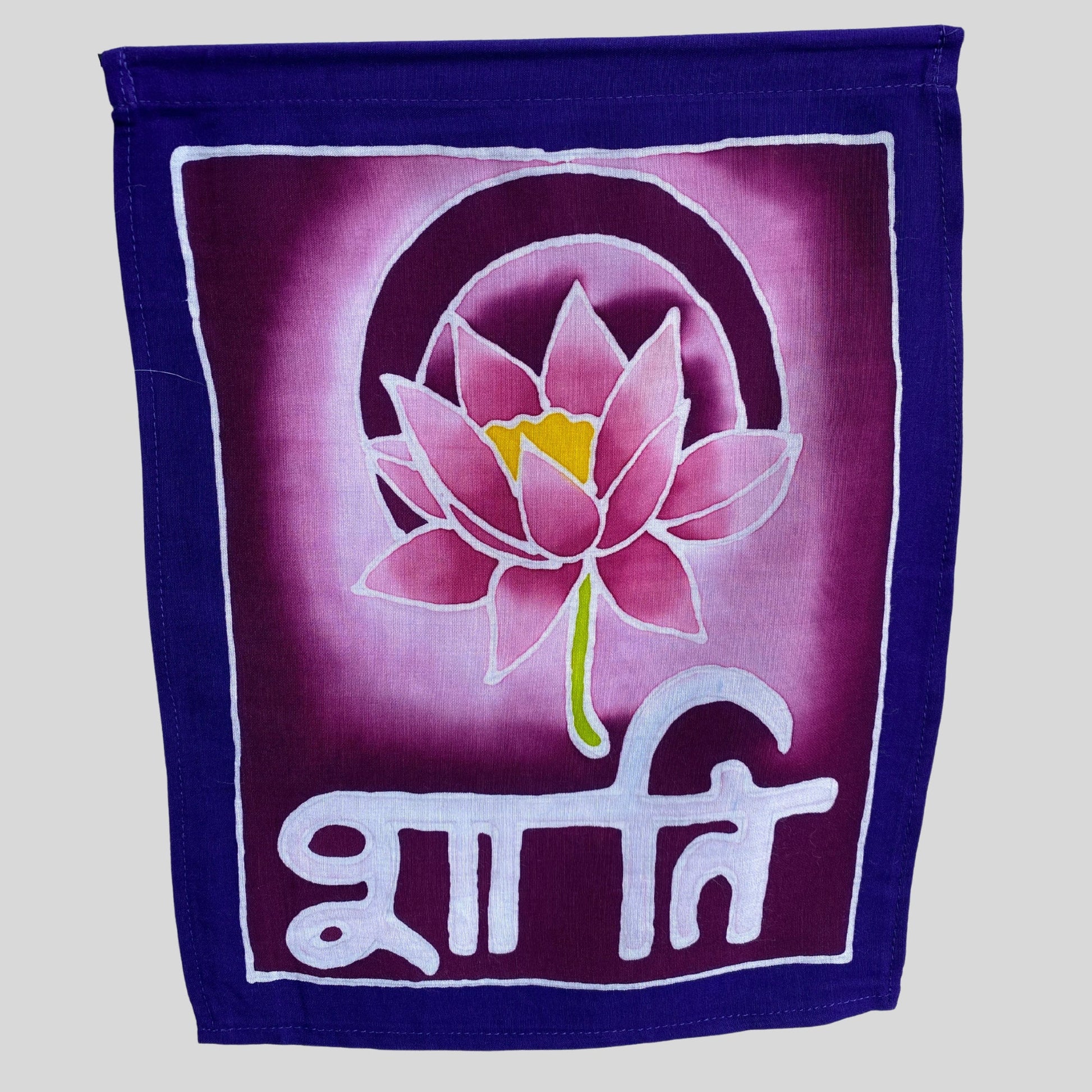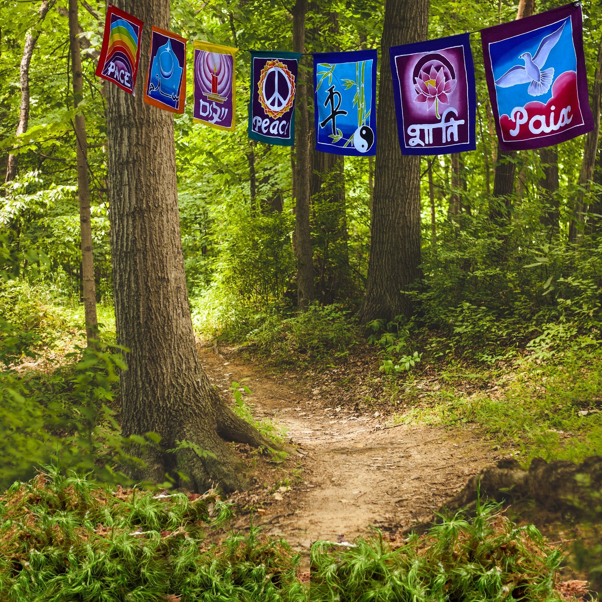 Seven flags on a cord with words for peace in different languages and symbols. Our gorgeous prayer flags are all completely hand crafted on the Island of Bali. Each flag is painstakingly hand batik-ed by a group of Balinese Ladies in the Ubud Area. Ubud is famous for this type of batik painting. The wax is drawn on to each hanging in the desired design. The colors are then brushed on by hand with simple bamboo brushes , and blended. The wax forms a block and prevents the colors from bleeding into one another. When they are done applying the colors, the dyes are set, and the wax is removed. And the amazing fabrics are laid out in the rice fields to dry. This results in a beautiful depth of color you would never find in a mass produced machine printed fabric.